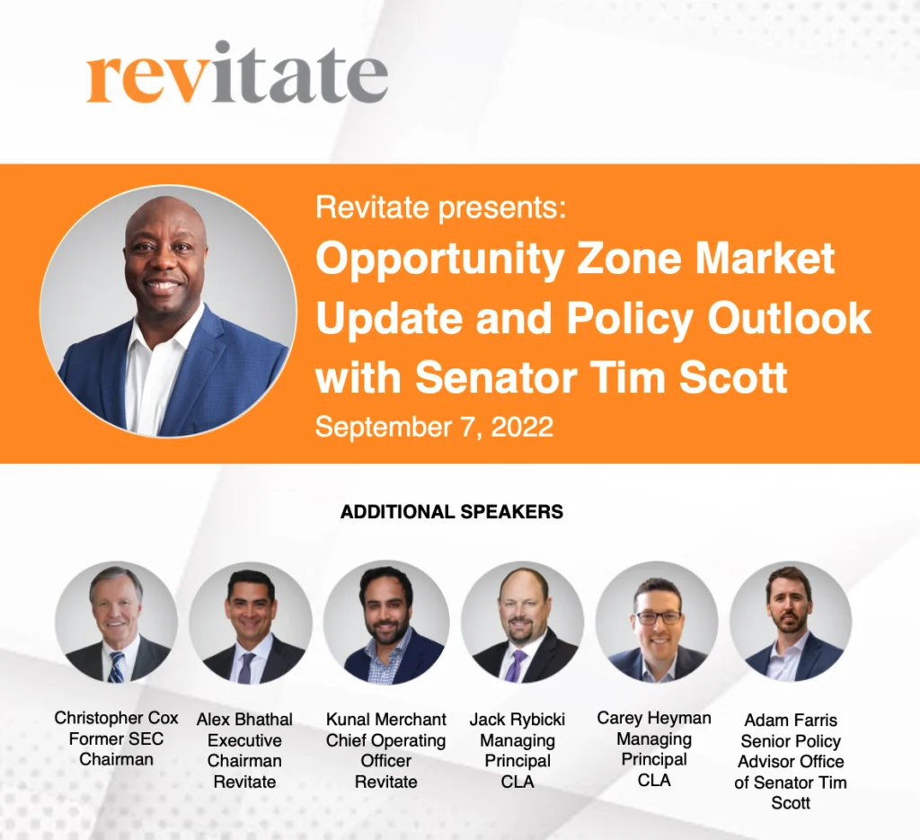 On Wednesday, September 7th, Revitate hosted a special live webcast featuring U.S. Senator Tim Scott to discuss the current state of the Opportunity Zone (OZ) marketplace and federal policy discussion.